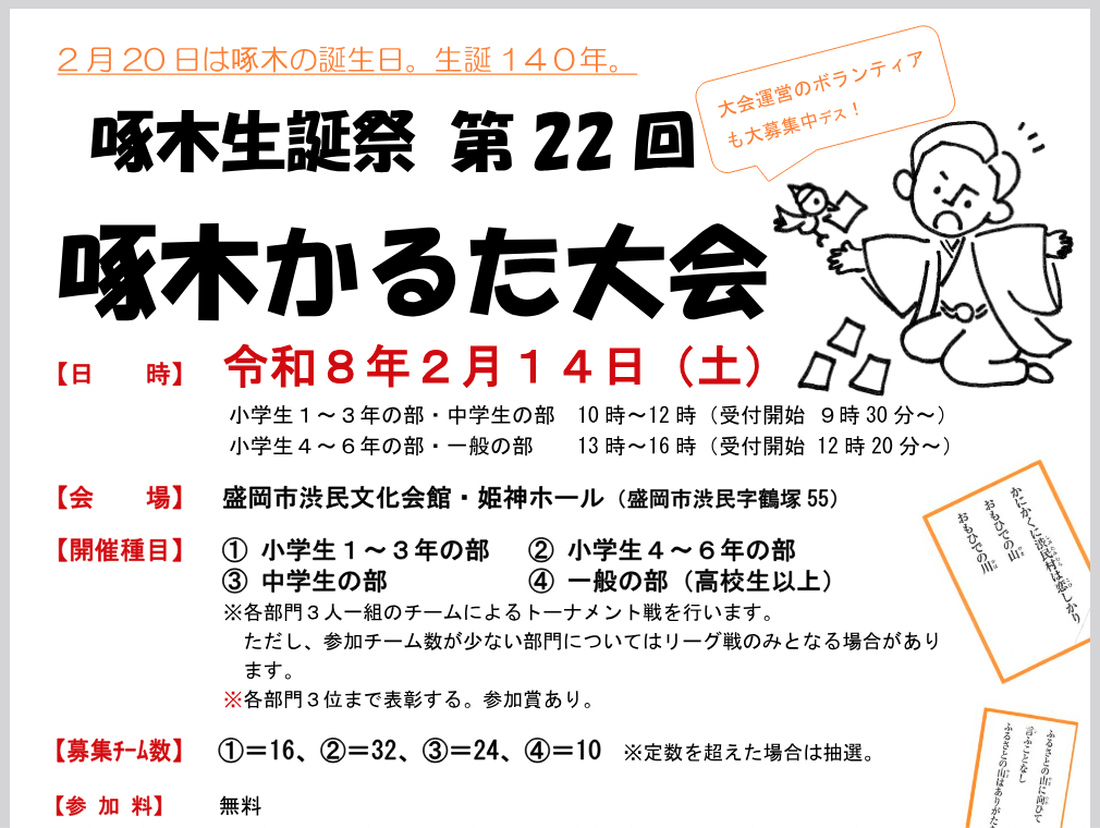 2/14(土)啄木生誕祭 第22回啄木かるた大会開催のお知らせ